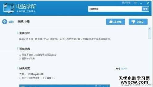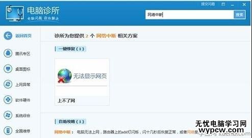 在騰訊電腦管家的電腦門診頁面中,找到搜索功能輸入網絡中斷,進行搜索相關的解決方案,按回車即可搜索。
