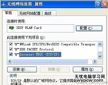 點擊無線網絡練級界面的屬性按鈕,進入到相關的屬性界面,在下圖所示的界面中找到IT的協議功能點擊打開。