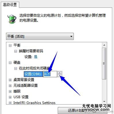 在電源選項高級設置里面,將硬盤的關閉時間調成“從不”操作方法:“將設置(分鐘)中的10”改為0,再點擊向下箭頭就會出現“從不”。經過以上設置,電腦在休眠的時候就不會斷網,以及停止運行了