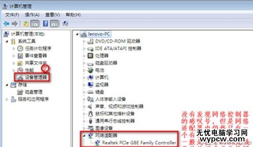 7、然后查看一下“網絡適配器”,沒有發現網絡控制器的感嘆號,但是網絡適配器中仍然只有一個有線網卡的設備,一般是有一Bios無線開關關閉或者無線網卡硬件故障導致的,可開啟bios無線開關測試;