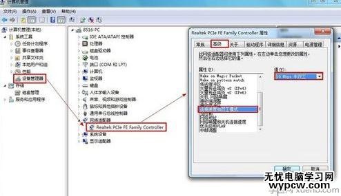 五:從“網絡適配器”選項打開的下拉表中選擇我們使用的網卡,最后右鍵屬性,在彈出來的界面中點擊“高級”導航,并在下方的屬性列表中選中“連接速度和雙工模式”,接著在“值”那里選中“10Mbps半雙工”即可。
