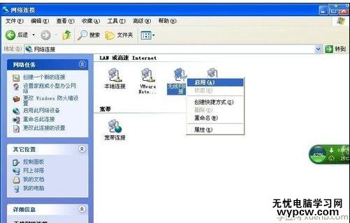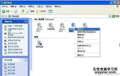 依次打開“網上鄰居->查看網絡連接”,找到“無線網絡連接”,選中后右鍵->停用,把電腦的無線網卡禁用。
