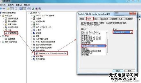 五:從“網絡適配器”選項打開的下拉表中選擇我們使用的網卡,最后右鍵屬性,在彈出來的界面中點擊“高級”導航,并在下方的屬性列表中選中“連接速度和雙工模式”,接著在“值”那里選中“10Mbps半雙工”即可。