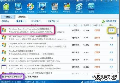 第一步:如果點擊刷新網絡列表時出現“Windows無法配置此連接”的提示,則打開金山衛士的“系統優化”功能,點擊“開機加速”選項卡,點擊“服務項”,選中左下角的“顯示已禁止啟動的項目”,然后在列表中找到“Wireless Zero Configuration(無線配置服務)”,點擊右側的“開啟”即可。然后在開始-運行中,輸?a href=http://www.xuenb.com/web/aspx/ target=_blank class="infotextkey">.net start wzcsvc,回車即可。筆記本無線網絡連接不上的癥狀即可解決。