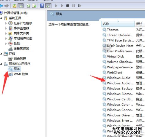 4、然后找到服務和應用程序,點擊打開找到服務點擊,在右方的列表中找到windows Audio選項。