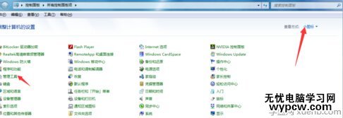 2、進入控制面板界面點擊右上方的查看方式選擇小圖標,然后在列表中找到系統管理選項,點擊進入。