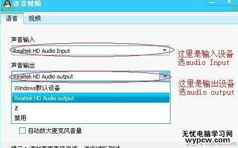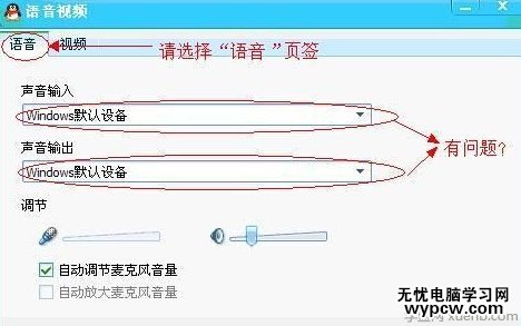 在彈出的語音視頻對話框中,選擇“語音”選項卡,嘗試將下面的“聲音輸入”和“聲音輸出”都改為“windows默認設備”: