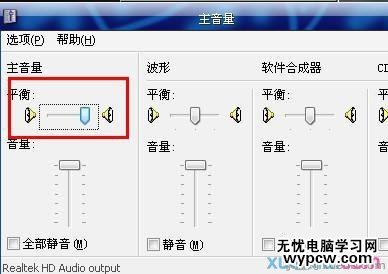 如果以對話框中沒有這兩個選項,請點擊“選項”菜單——選擇“屬性”——在“顯示下列音量控制”中選中“音量控制”和“波形”兩項,再進行正確設定。