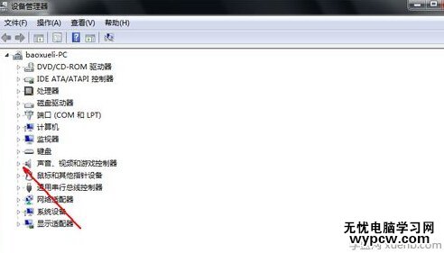 在設(shè)備管理器中,列出了電腦的所有硬件,其中在聲音視頻和游戲控制器選項(xiàng)中,包含了聲卡驅(qū)動(dòng)的信息。用鼠標(biāo)點(diǎn)擊一下前面的小三角。