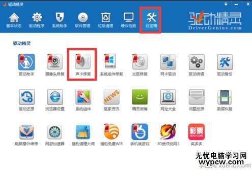 3、或者我們也可以使用“驅動精靈”來修復聲卡沒聲音的故障:打開“驅動精靈”程序,切換到“百寶箱”選項卡,點擊“聲卡修復”按鈕;