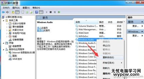 12、從打開的“計算機管理”窗口中 ,依次展開“服務和應用程序”-“服務”,在右側找到“Windows Audio”服務并右擊,選擇“重新啟動”項,嘗試通過重啟此服務還解決問題。