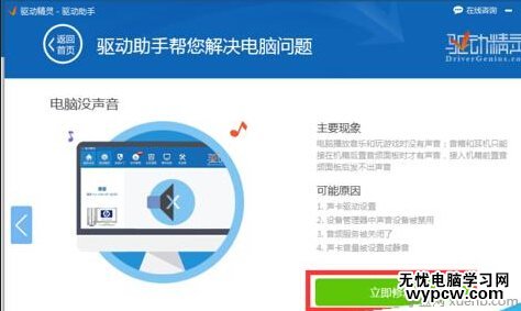 4、并從彈出的“聲卡修復”界面中,可以了解有關聲卡沒有聲音的具體原因,直接點擊“立即修復”按鈕,明智“驅動精靈”完成聲卡修復操作;