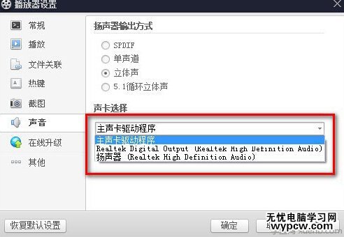 1、進(jìn)入百度影音設(shè)置,然后找到聲卡設(shè)置,檢查下聲卡配置是否正常,如下圖所示。