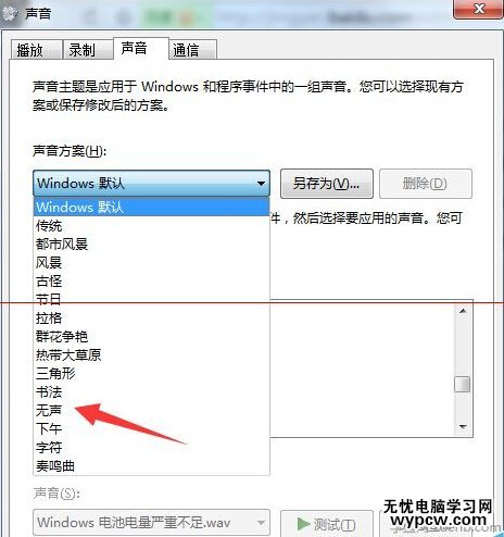 6、然后在【聲音方案】選項(xiàng)里,找到【無(wú)聲】點(diǎn)擊選擇,然后點(diǎn)擊右下角應(yīng)用,確定。