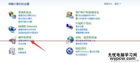 2、進(jìn)入控制面板選項(xiàng),找到【硬件和聲音】點(diǎn)擊進(jìn)入