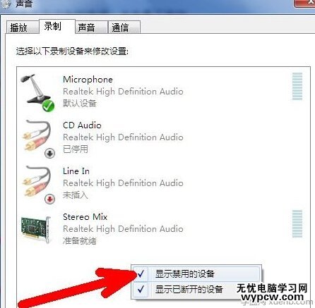 3、接下來的界面就是錄音設(shè)備的選項。點擊右鍵,選擇“顯示禁用的設(shè)備”。
