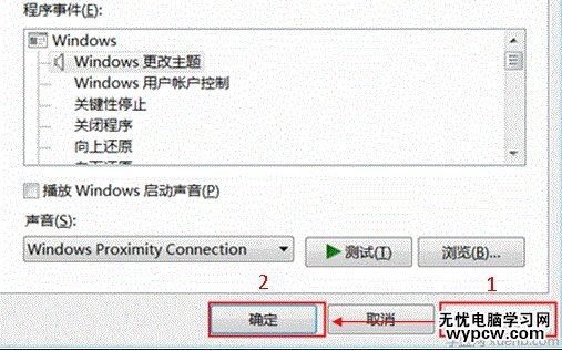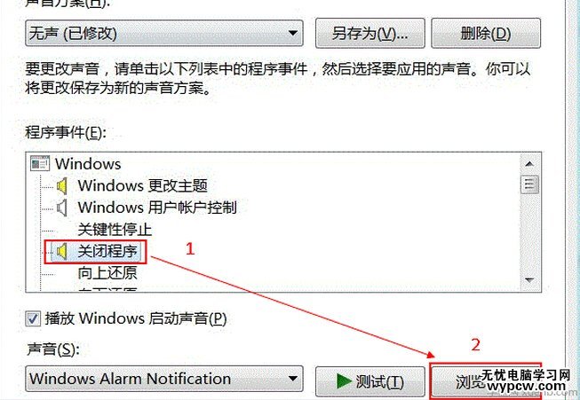 5、同時也可以自定義系統單一事件聲音方案,先選擇事件“關閉程序”,然后點擊 “聲音”的下拉列表或“瀏覽”添加自定義的WAV聲音文件。參見下圖