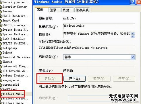 6、每個設備都有依賴的服務,音頻設備也不例外,如果相應的服務沒有開啟的話,那么沒有聲音也屬正常。和聲音相關的服務是一個叫做windows audio的服務,我們可以進入到服務列表查看它是否開啟,如果沒有開啟的話把它開啟即可解決問題。