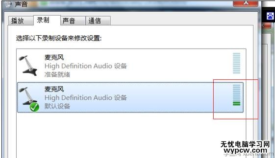 然后將彈出“聲音”對話框,如下圖所示。,紅框里可以用來測試麥克風是否有聲音,說話的時候綠條會產生波動。