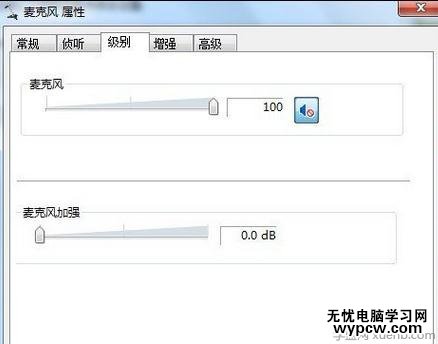 點擊“麥克風”屬性→“級別”將“麥克風”音量調到最大,“麥克風加強”調到最小,點擊“應用→確定”設置完成。