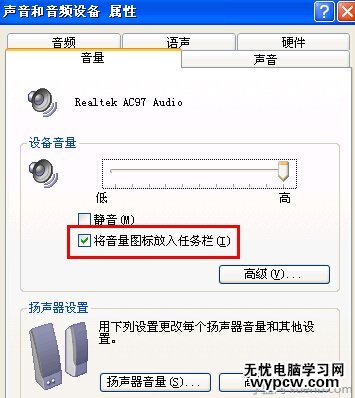 3、在打開的窗口中,切換至“音量”選項卡,勾選“將音量圖標放入任務欄”選項即可。