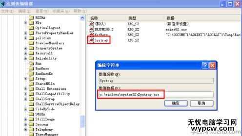 7、新建字符串“Systray”,并設置其值為“c:/windows/system32/Systray.exe”。