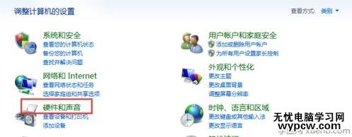 打開(kāi)“控制面板”,把查看方式設(shè)置為“類(lèi)別”,找到“硬件與聲音”,并打開(kāi)。
