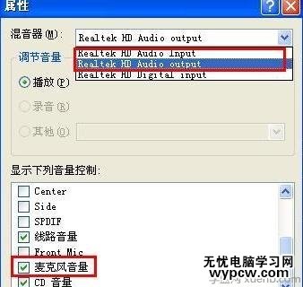 在新的屬性窗口中選擇混合器中的,Input和Output,點擊切換在下面的音量控制器中也會出現不同的界面,然后我在Output看到麥克風沒有勾選,于是將Output里的麥克風勾選上。