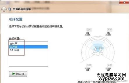 在打開的“揚聲器”中,選擇不同的音頻頻道,測試聲音。(這個時候要把耳機插在主機前邊的耳機孔中),找到一個有聲音的音頻頻道,點擊下一步,完成即可。