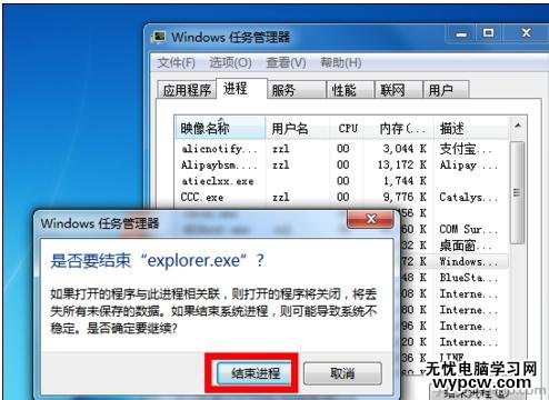 在任務管理器中選擇進程--找到explorer.exe,選中后點擊右鍵--結束進程!