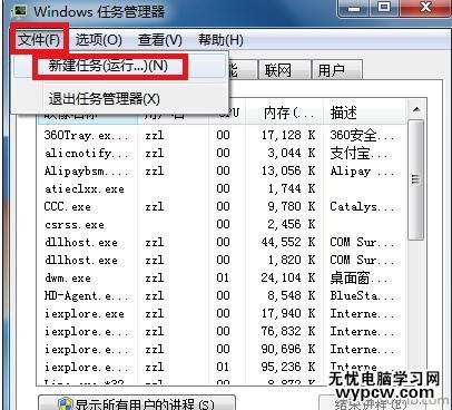 在進程頁面,選擇文件--新建任務運行,如下圖所示!
