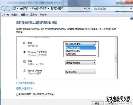 在“通知區域圖標”框中找到“音量”選項,將下拉選項改為“顯示圖標和通知”,最后點擊確定,如圖2所示: