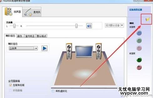 在“Realtek高清晰音頻管理器”窗口中,選擇右上角的小文件夾圖標。