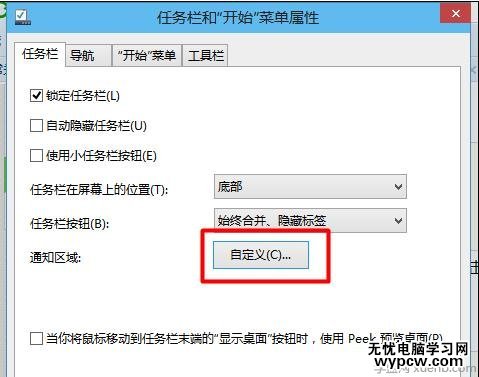 在“任務(wù)欄和開(kāi)始菜單”屬性窗口中我們單擊“自定義”按鈕