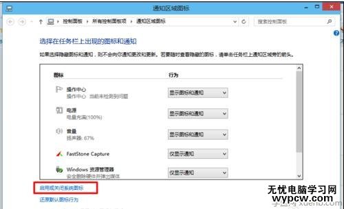 我們點(diǎn)擊“通知區(qū)域圖標(biāo)”窗口下面的“啟用或關(guān)閉系統(tǒng)圖標(biāo)”