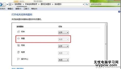 在“打開或關(guān)閉圖標(biāo)”窗口,我們發(fā)現(xiàn)那個(gè)聲音的圖標(biāo)的行為是“關(guān)閉”狀態(tài),而且那個(gè)下拉菜單也不能使用,這個(gè)時(shí)候我們能排除是關(guān)閉了,然后我們繼續(xù)操作