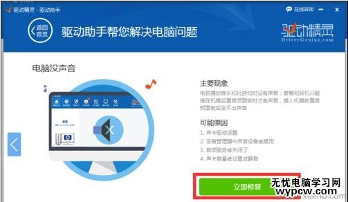 并從彈出的“聲卡修復(fù)”界面中,可以了解有關(guān)聲卡沒有聲音的具體原因,直接點(diǎn)擊“立即修復(fù)”按鈕,明智“驅(qū)動精靈”完成聲卡修復(fù)操作。