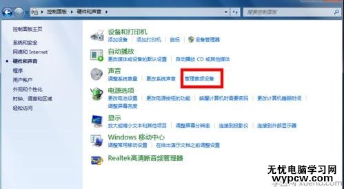 在硬件與聲音頁面點擊“管理音頻設備”,如下圖所示!