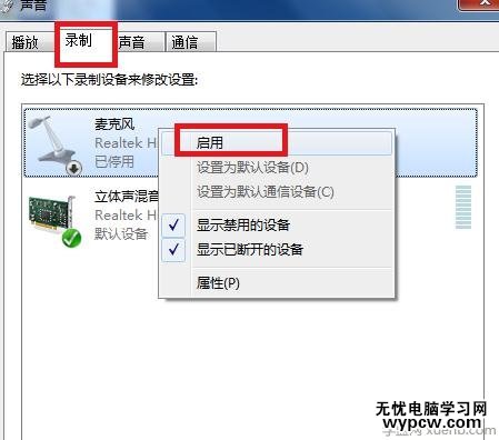 在聲音選項卡選擇錄制,在錄制界面,右鍵單擊麥克風,然后選擇啟用,如下圖所示!