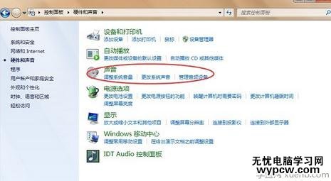 第二步,進(jìn)入硬件和聲音的選項(xiàng)后,點(diǎn)擊聲音的選項(xiàng),進(jìn)入對(duì)麥克風(fēng)的設(shè)置。