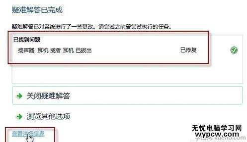 此時,如果插入耳機或揚聲器,并點擊下一步按鈕,系統(tǒng)會自動更改修復,并給處如下對話框: