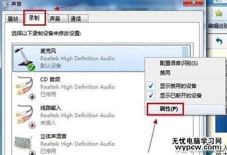 2進入“聲音”對話框,切換到“錄制”選項卡,直接雙擊“麥克風”選項或鼠標右鍵單擊“屬性”命令。