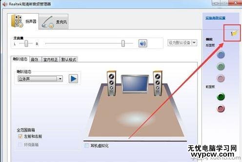 在“Realtek高清晰音頻管理器”窗口中,選擇右上角的小文件夾圖標。