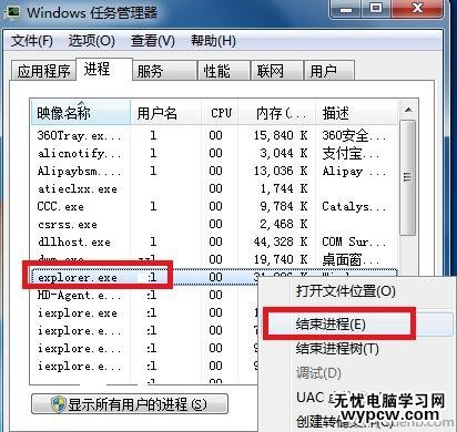 在任務管理器中選擇進程--找到explorer.exe,如下圖所示,選中后點擊右鍵--結束進程!