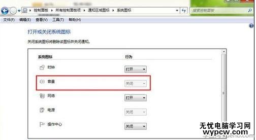 在“打開或關閉圖標”窗口,我們發現那個聲音的圖標的行為是“關閉”狀態,而且那個下拉菜單也不能使用,這個時候我們能排除是關閉了,然后我們繼續操作