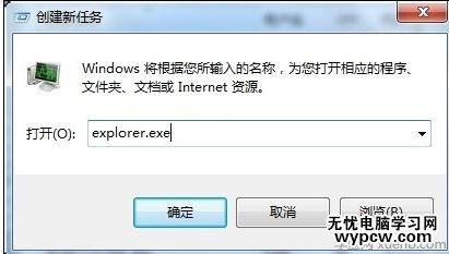 點擊任務管理器的“文件”菜單,新建一個任務,在輸入框中輸入Explorer.exe,然后點擊“確定”按鈕,這個時候任務欄就重啟了,那個小喇叭也有了