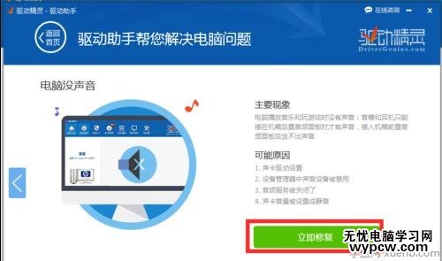 并從彈出的“聲卡修復”界面中,可以了解有關聲卡沒有聲音的具體原因,直接點擊“立即修復”按鈕,明智“驅動精靈”完成聲卡修復操作。