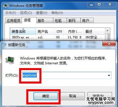在運(yùn)行窗口輸入explorer。點(diǎn)擊確定按鈕,好了,桌面恢復(fù)正常,然后右下角的小喇叭回來了!