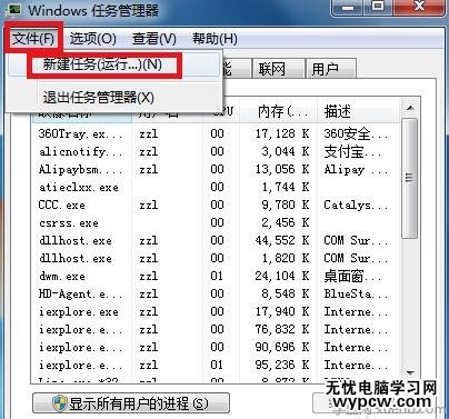 在進程頁面,選擇文件--新建任務運行,如下圖所示!