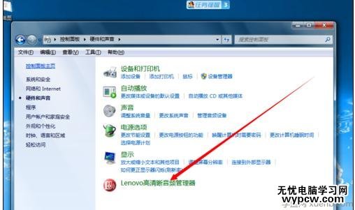 打開“硬件和聲音”以后會出現下圖所示的界面,選擇“高清晰音頻管理器”。XP的選擇“Realtek高清音頻配置”。(下圖為W7的界面,XP的大家仔細的找一下“Realtek高清音頻配置)